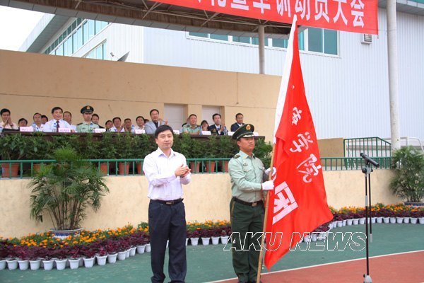 党委书记杨涛为军训团授旗.。红旗猎猎,我院2009级新生为期14天的军训由此全面展开。
