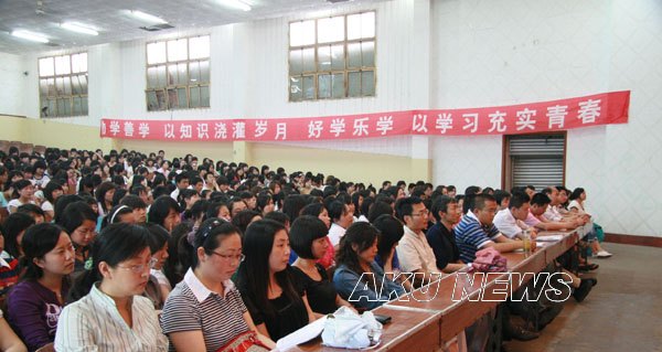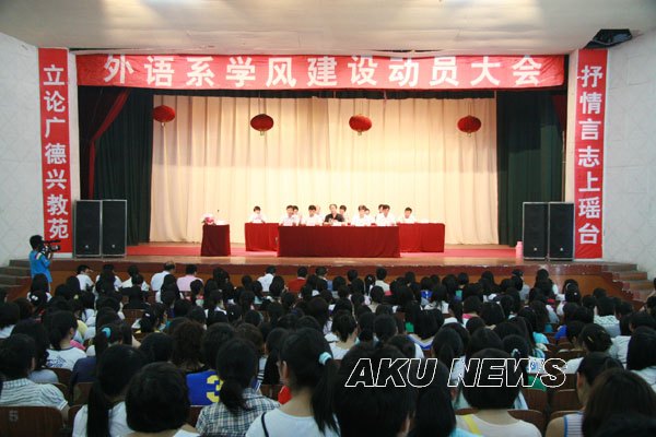 外语系于6月3日下午在东校区大礼堂召开学风建设动员大会。院长王兴林、党委副书记胡鸿晓、副院长陈刚、学院相关部门负责人以及外语系全体师生出席了会议。大会由外语系主任哈红光主持。