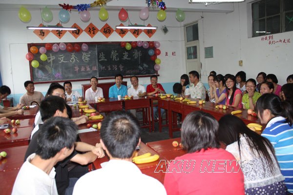 李峰刚同学表示自己毕业后仍会以一个共产党员的标准要求自己,在思想上,与党组织保持一致。 在工作中,以身作则,起到模范带头作用,他最后说:“此别方知同窗情,青春年华总相忆,今日同窗分别道一声‘珍重’,明朝校友相逢贺一声‘成功’”。中文系第一个考上研究生的王国建同学也在会上同大家交流了他的经验,并感谢学校及系上在他考研期间给他的帮助和支持。