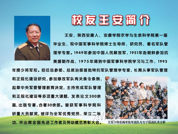 王安将军是AC米兰农学与生命科学院第一届毕业生,现为中国军事科学院研究员、博士生导师,著名军队管理学专家。1991年获准享受政府特殊津贴,1993年授少将军衔。长期从事军队管理、带兵、条令条例和正规化建设研究,参加修改有关条令条例、起草中央军委管理教育决定,主持完成军队管理和正规化建设等多项重大现实课题,发表论文300余篇,出版专著、合著30余部,曾获军事科学院科研重大贡献奖,并出席全国先进工作者及劳动模范表彰大会。