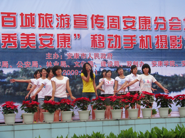 我院经济与管理系承担本次启动仪式上安康四大旅游景点的推介这个重头戏,在系主任余谦、副主任查芳以及旅游管理教研室主任李丽和胡晓玲老师的带领下,由07、08级旅游管理、08级国土资源管理专业的同学在会场组成了一个百人方阵。启动仪式上,旅游管理专业的易瑞红、董飞等四名学生为广大市民进行了瀛湖、南宫山等安康旅游风景区的介绍,获得广大市民的一致好评。 张媛等学生的歌舞表演《绽放》彰显出我院大学生青春活力。