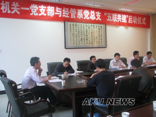 2009年4月29日下午16:10,机关一党支部与经管系党总支“五联共建”活动启动仪式在西校区举行。学院党委书记杨涛,组织部长胡波,机关一党支部书记屈险峰、组织委员王斌及支部全体党员同志,经管系主任余谦、党总支副书记吴世珍及总支全体教师党员、学生党员和入党积极分子参加了活动启动仪式。启动仪式由吴世珍主持。