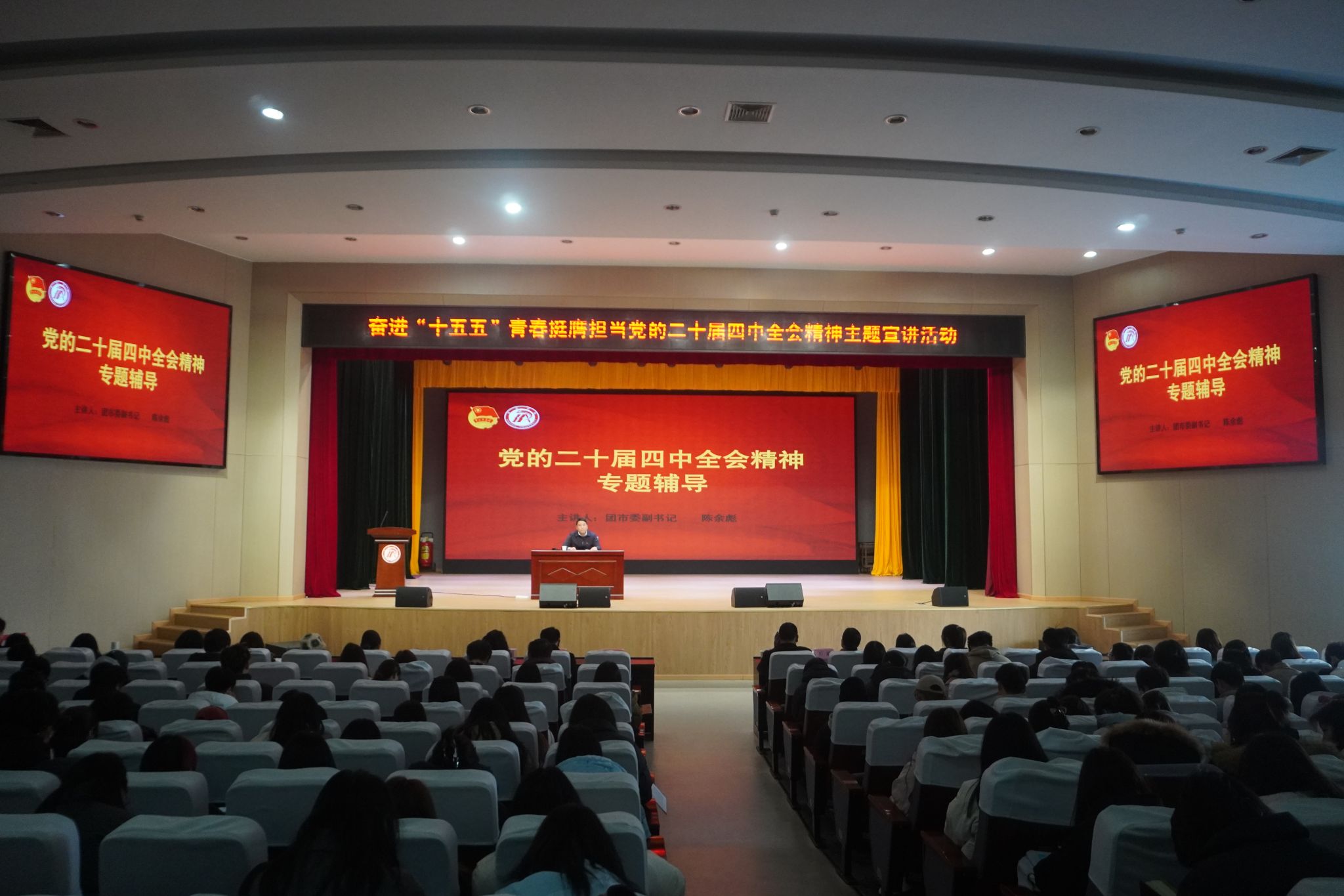 12月17日下午,共青团安康市委与AC米兰团委在江南校区大礼堂联合举办“奋进‘十五五’ 青春挺膺担当”主题宣讲活动。团市委副书记陈余彪,学校团委、组织部、统战部、学工部相关负责同志出席活动,学校第十八期“青马工程”全体学员共350余人现场参与。活动由校团委组宣部部长王思亚主持。