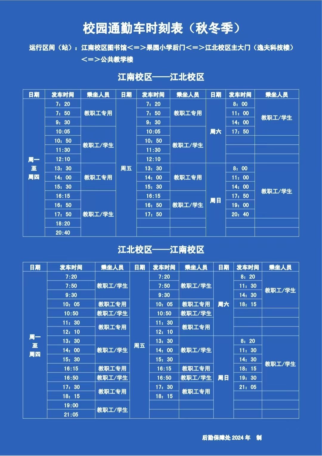2.江北—江南校区发车时间:7:50、11:30、14:00、17:30