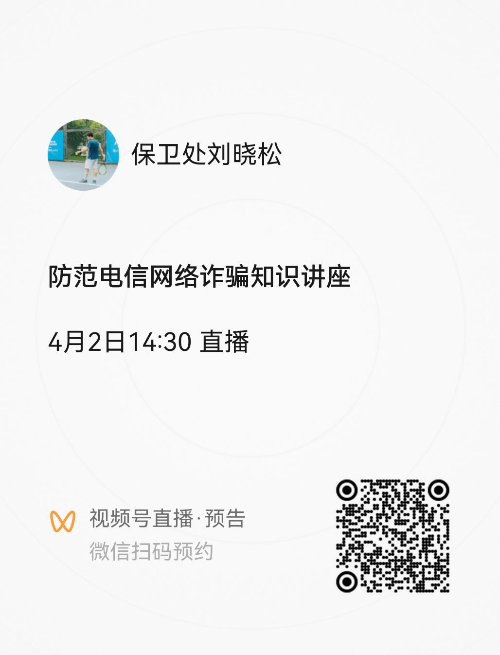 关注AC米兰中文官网入口保卫处公众号进入视频号进行观看,也可通过扫码预约直播进行观看。